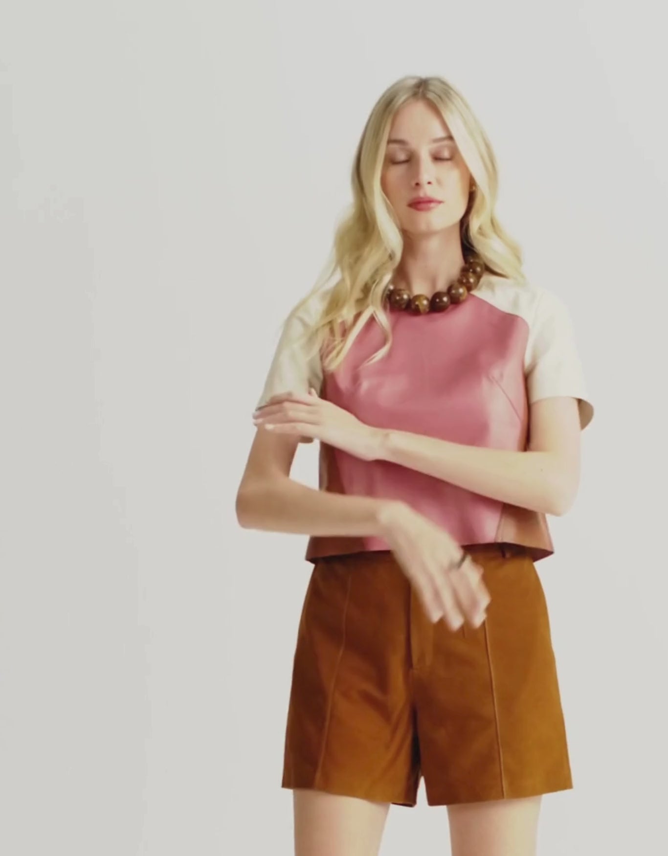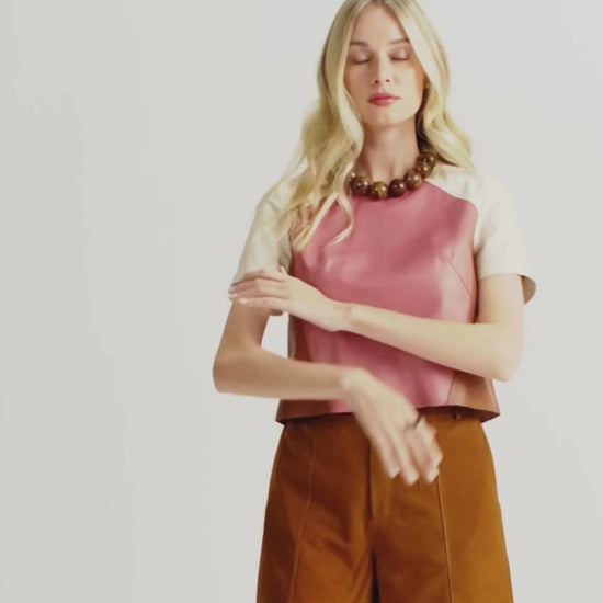 A Blusa Gaia Color confeccionada em couro legítimo com design sofisticado e contemporâneo. A peça apresenta recortes estratégicos que valorizam o shape e criam um interessante jogo geométrico entre as cores: o rosa romã domina a parte da frente, contrastando com as laterais em caramelo, que afinam visualmente a silhueta. As mangas curtas e o decote redondo são em couro off-white, o que traz leveza ao conjunto e equilíbrio ao visual.