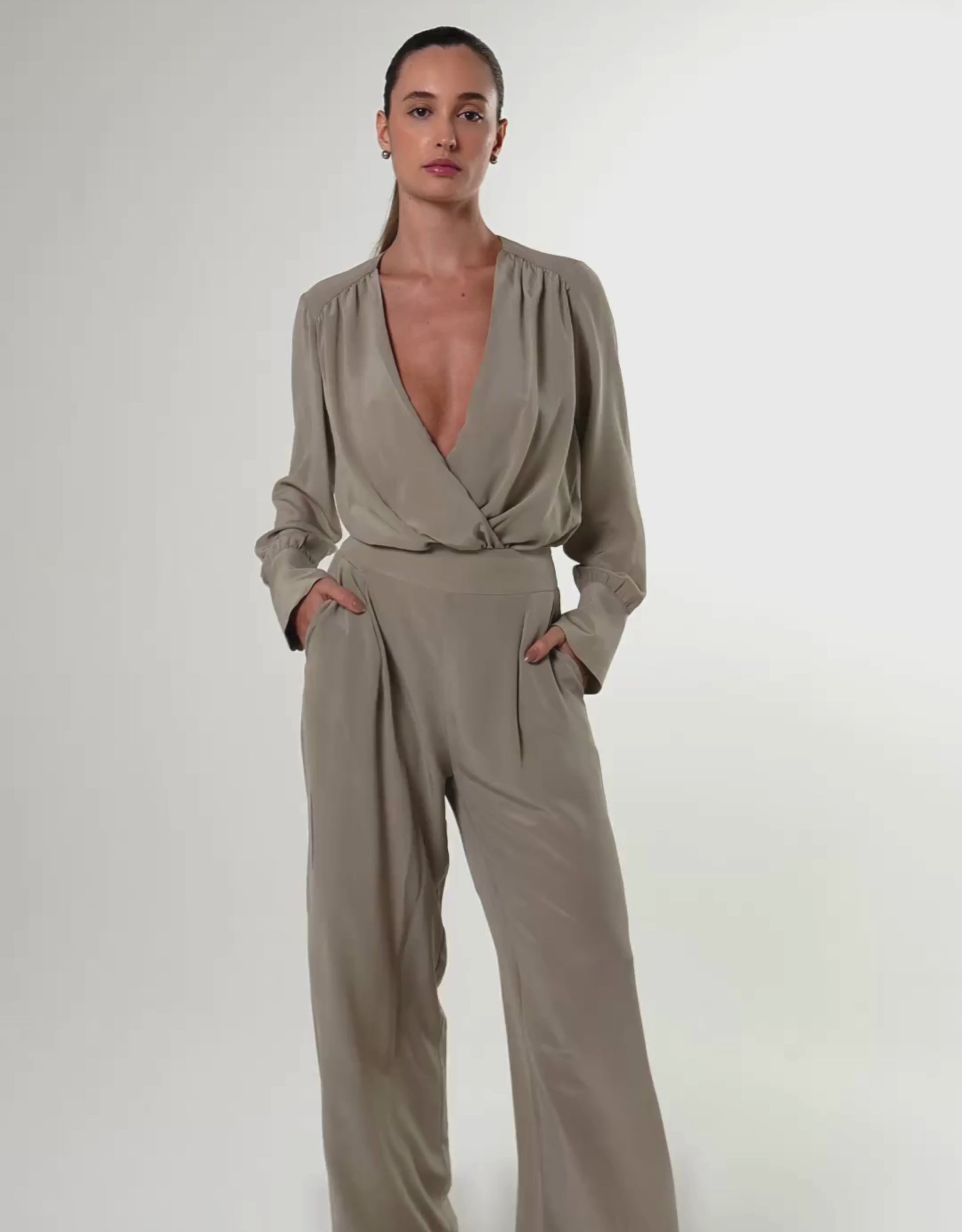 Possui decote em V profundo, mangas longas e volumosas com punhos largos que criam um visual fluido e elegante.