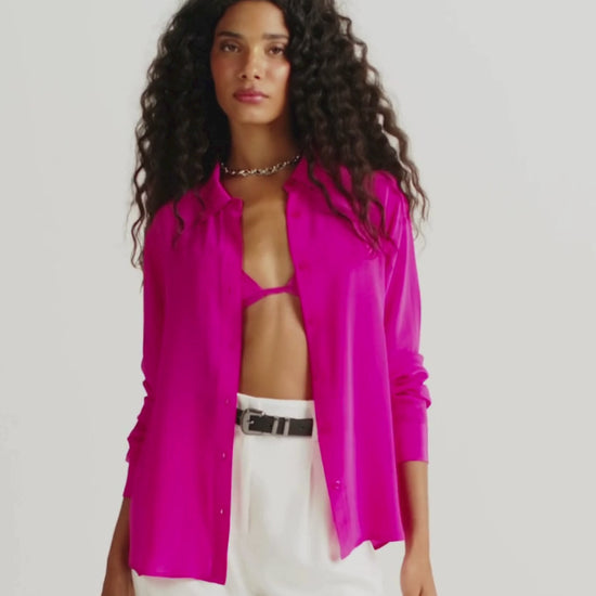 A Camisa Clássica Pesponto é confeccionada em seda, tecido nobre que confere sofisticação, leveza e caimento impecável à peça. Com modelagem atemporal, ela apresenta gola clássica, fechamento frontal por botões e mangas longas com punhos marcados.