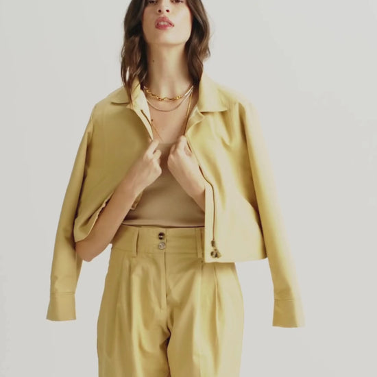 A Jaqueta Cléo apresenta um design moderno e minimalista, com modelagem cropped que valoriza a silhueta e confere um ar contemporâneo ao look.