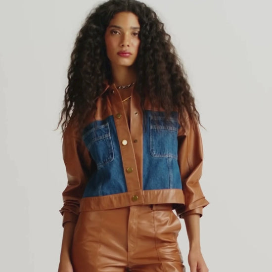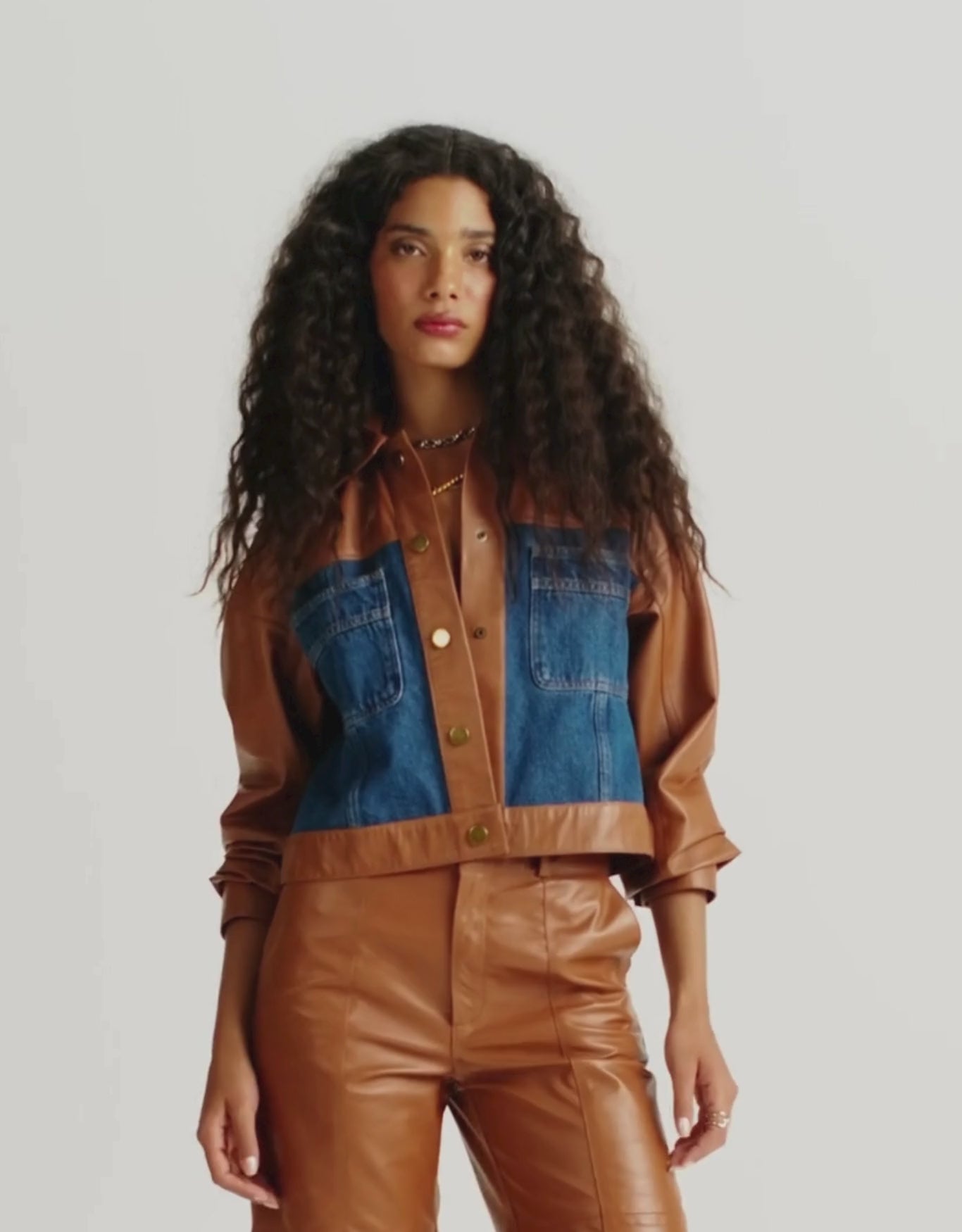 A Jaqueta Letty possui um design moderno e ousado, combinando dois materiais distintos: jeans e couro. A parte principal da peça é estruturada em blue jeans, enquanto as mangas, pala e detalhes são confeccionados em couro caramelo, criando um contraste estiloso. O modelo apresenta fechamento por botões metálicos frontais, bolsos decorativos no peito e um caimento levemente oversized, conferindo um toque despojado. Todas as peças da coleção que fizemos a junção de tecidos com couro, usaremos o couro desenvolvido que pode ser lavado.