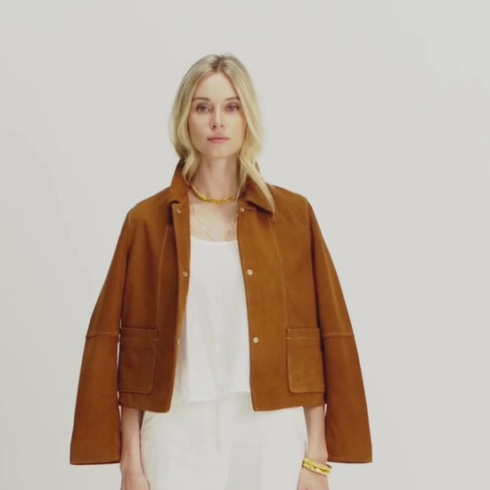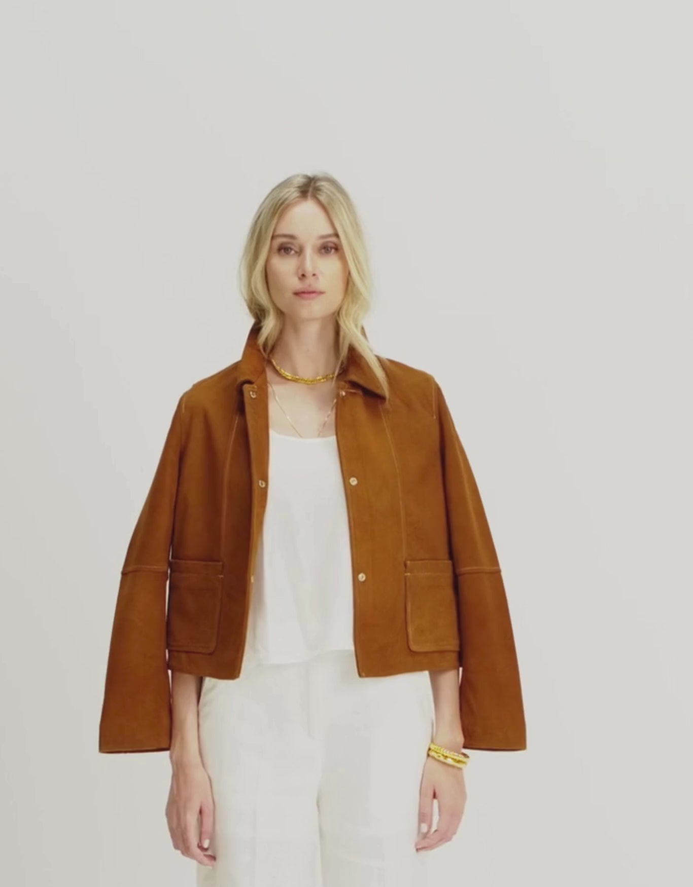 A Jaqueta Vitória é confeccionada em couro chamois, material de toque aveludado que confere sofisticação e suavidade ao visual.