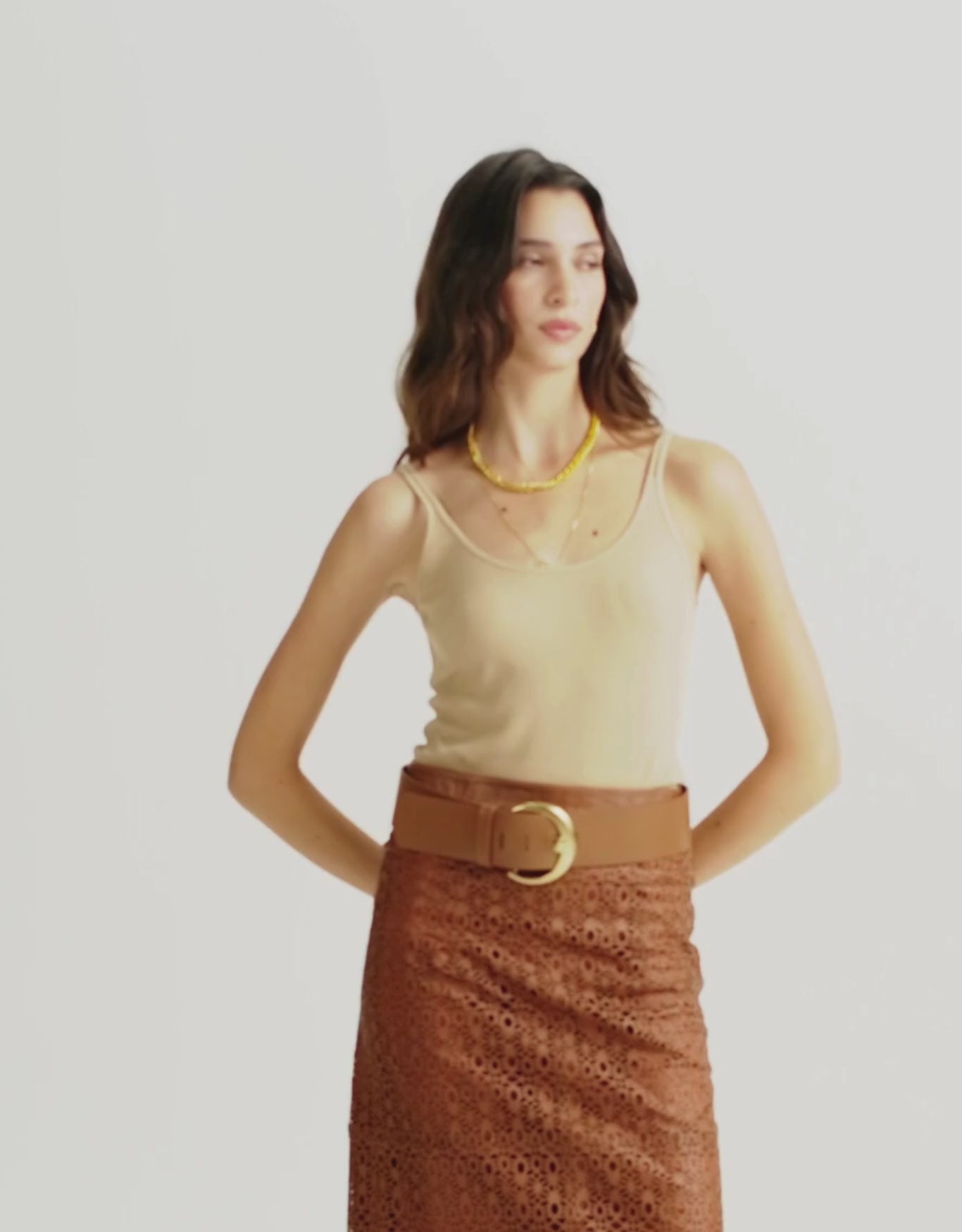 A Regata Rib é confeccionada em malha canelada de toque macio, que garante conforto e caimento ajustado ao corpo. Seu tecido com elasticidade modela suavemente a silhueta, proporcionando um visual leve e feminino.