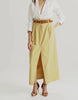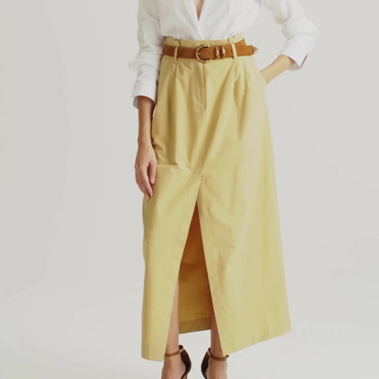 Com comprimento midi e cintura alta, valoriza a silhueta de forma refinada. A saia conta com pregas frontais, que adicionam volume sutil e movimento à peça, e uma fenda central, que proporciona leveza e conforto.