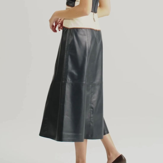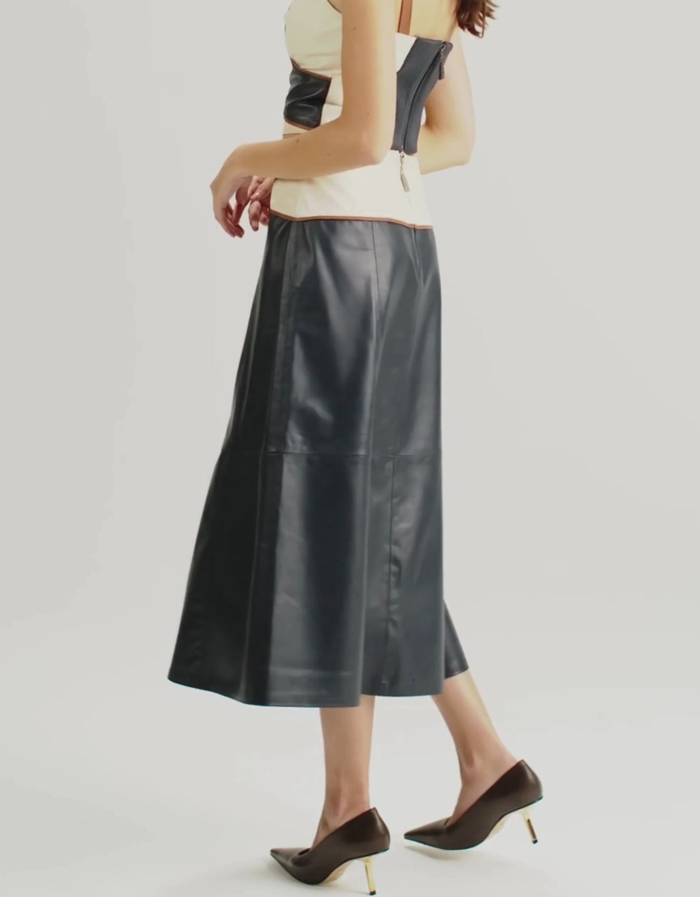 A Saia Midi Gaia Color é confeccionada em 100% couro e se destaca por seu design tricolor e recortes estratégicos que valorizam a silhueta com modernidade.