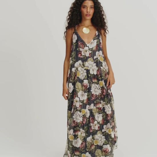 O Vestido Siena Estampado é confeccionado em seda leve com delicados fios de lurex, que adicionam um brilho sutil e sofisticado à peça. Estampado com o desenho exclusivo de romãs da Madre Reina, o modelo traduz o frescor e a leveza do verão com elegância.