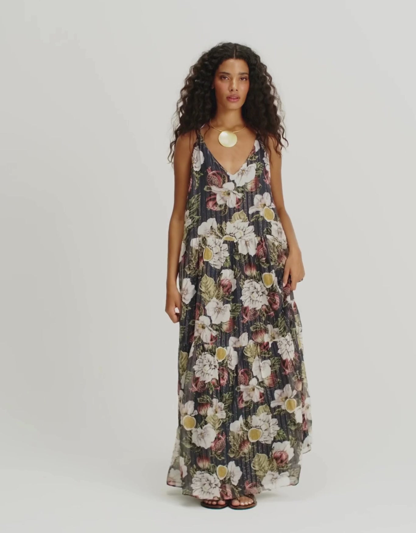 De comprimento longo e modelagem ampla, proporciona movimento fluido e caimento esvoaçante. Possui decote em V tanto na frente quanto nas costas, com alças finas ajustáveis por amarração, que permitem ajuste personalizado e um toque delicado.
